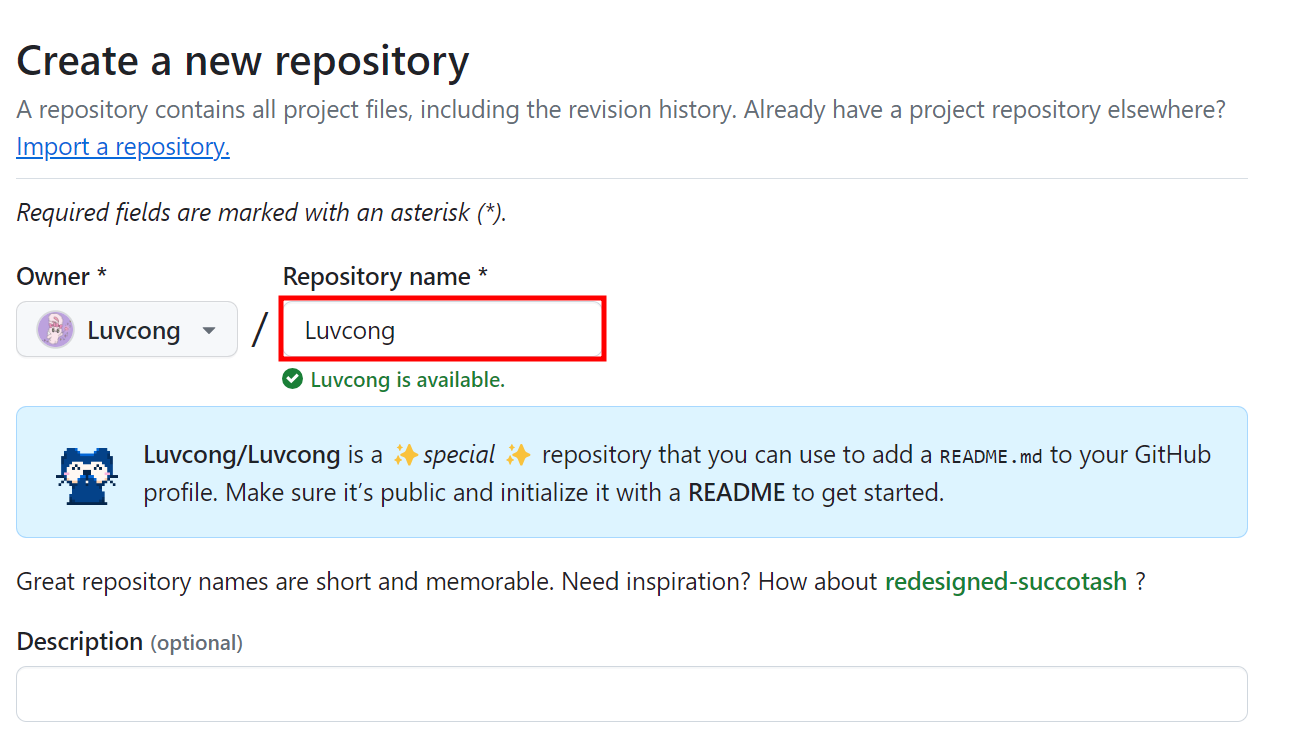 Repository Name에 내가 사용하고 있는 깃허브 아이디와 동일하게 작성하면