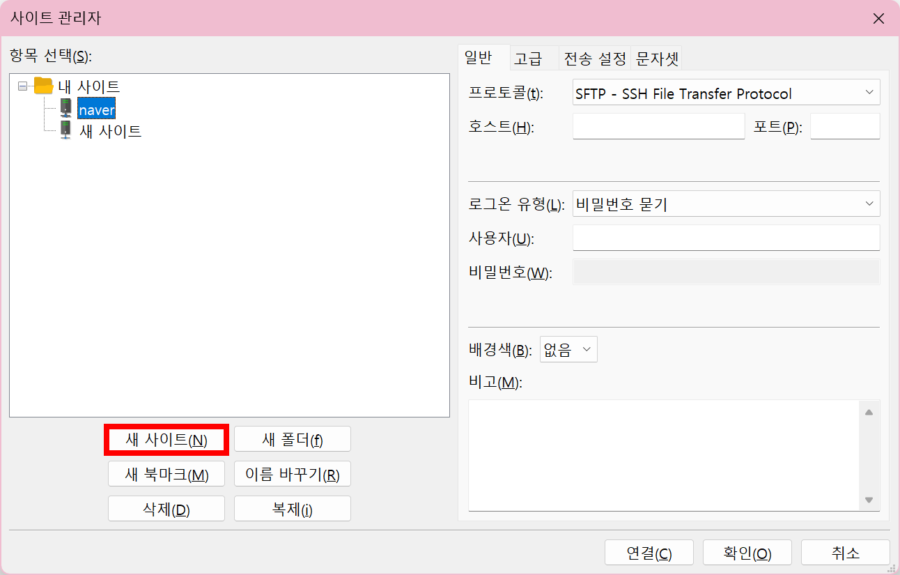 파일질라 상단메뉴 > 파일 > 사이트 관리자 > 새 사이트 클릭
