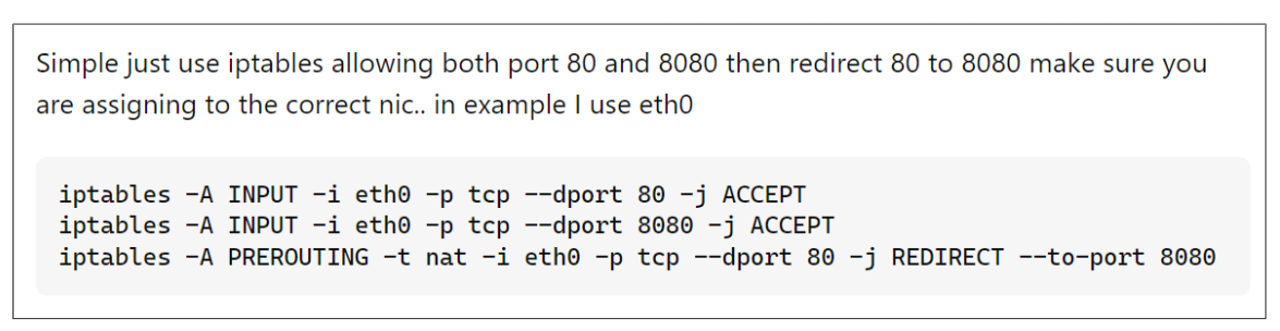 sudo iptables -A PREROUTING -t nat -i eth0 -p tcp --dport 80 -j REDIRECT --to-port 8080